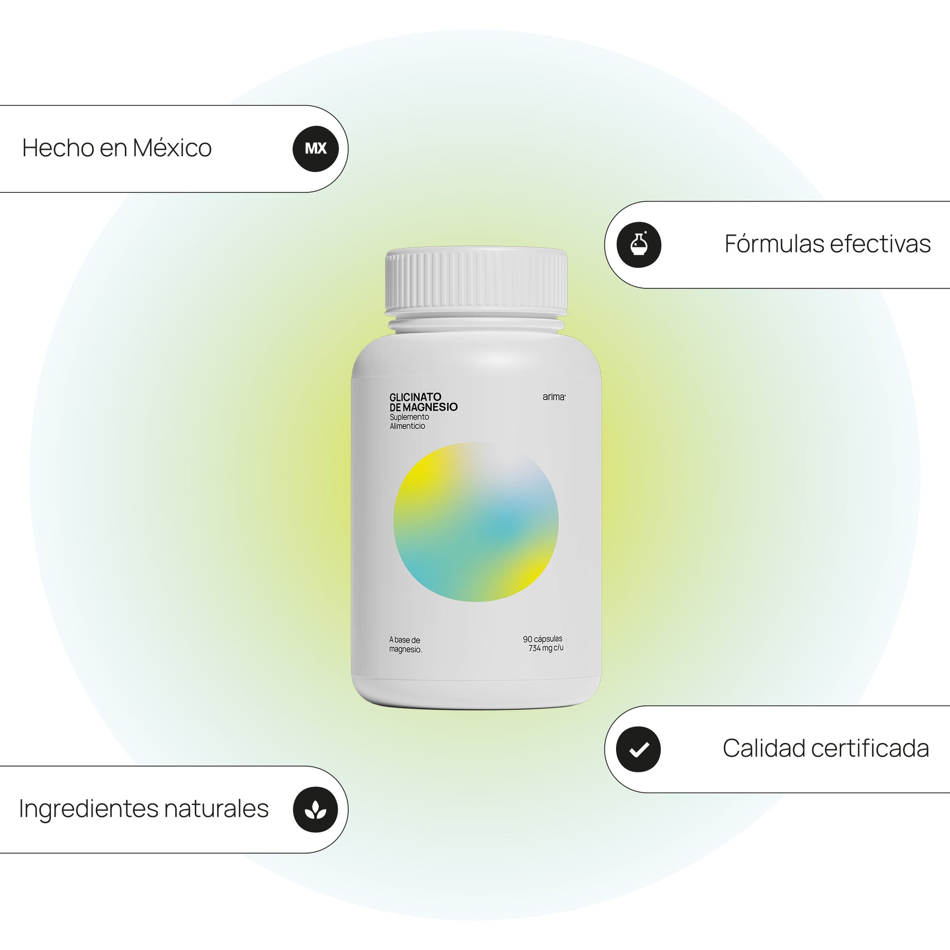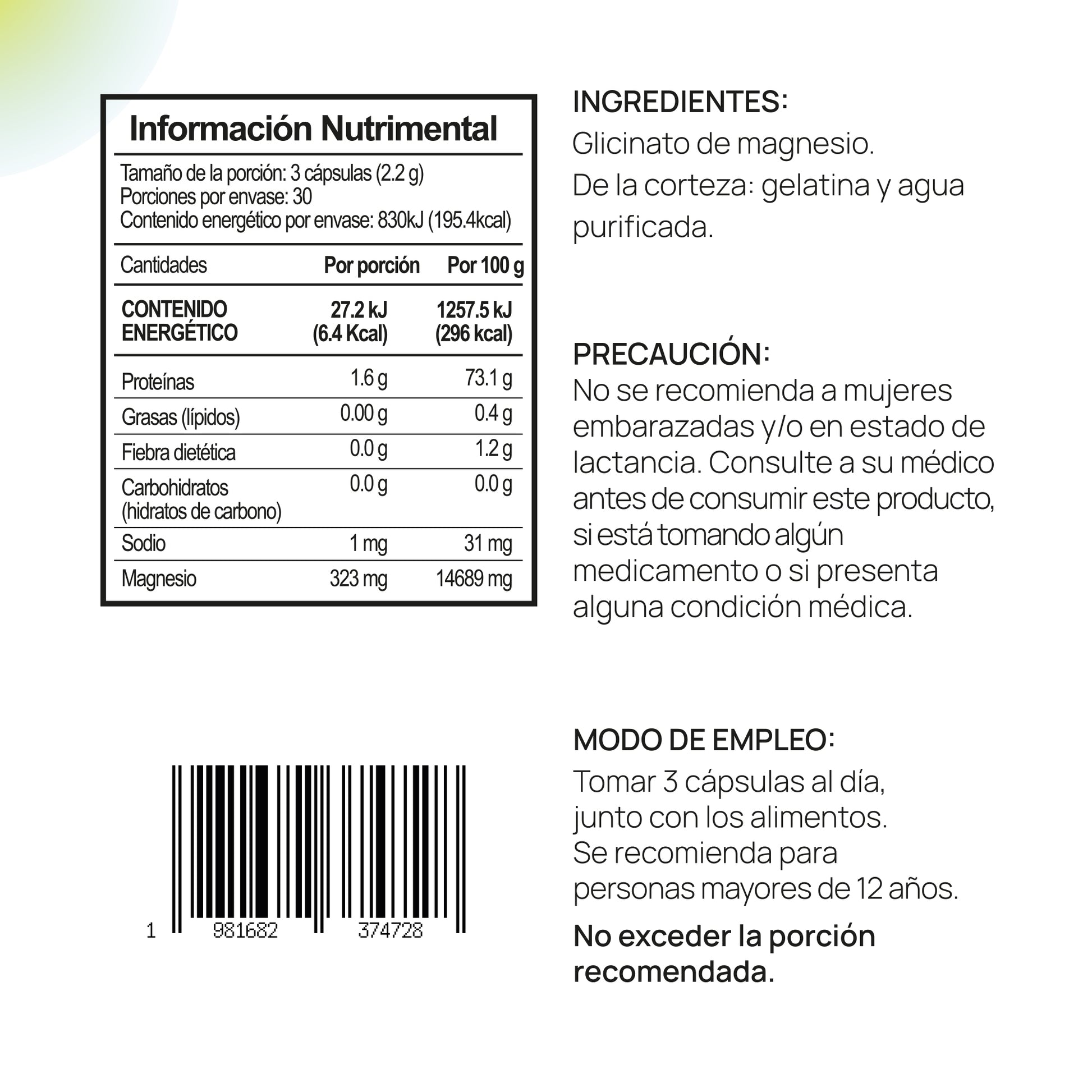 Suplemento alimenticio natural a base de Glicinato de magnesio, una forma de magnesio unido con glicina, un aminoácido que mejora su absorción en el cuerpo.